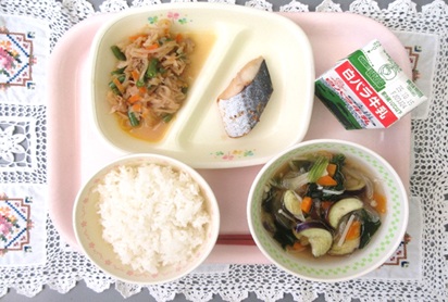 ご飯、牛乳、さわらのしょうが焼き、秋なすのすまし汁、切干大根の含め煮