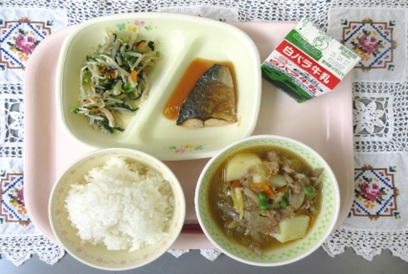 ご飯、牛乳、さばのみそだれかけ、肉じゃが、もやしとハムの酢の物