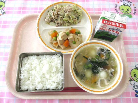 ご飯、牛乳、豚肉の塩こうじ炒め、白玉みそ汁、高野豆腐の煮物
