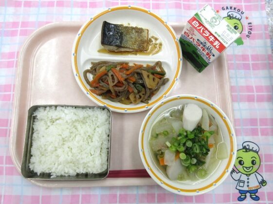 ご飯、牛乳、さばのごまだれかけ、とりっこみそ汁、れんこんのきんぴら