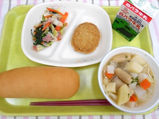 大山小麦黒糖パン、牛乳、手作りささみフライ、コロコロ野菜スープ、ブロッコリーのソテー、(中)月見ゼリー