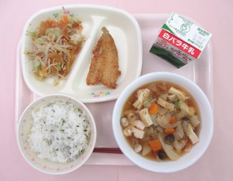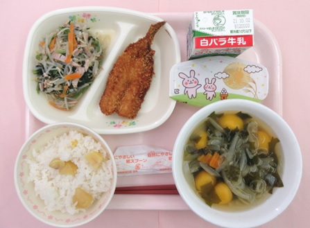 ご飯、牛乳、はたはたのから揚げ、若竹汁、ながいものみそ煮