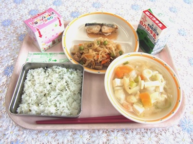 ご飯、牛乳、いわしのおろし煮、さつまいものみそ汁、ごぼうチキン