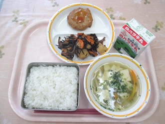ご飯、牛乳、若鶏肉の照り焼き、たまねぎのみそ汁、じゃがいものカレー煮