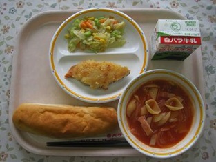 わかめご飯、牛乳、さわらのフライ、豆腐のすまし汁、さといもの煮物