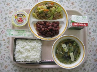 ゆかりご飯、牛乳、いわしの煮付け、わかめのみそ汁、豚肉と白菜の瑞穂生姜炒め