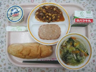 米粉パン、牛乳、ドライカレー、チンゲンサイのスープ、こふきいも