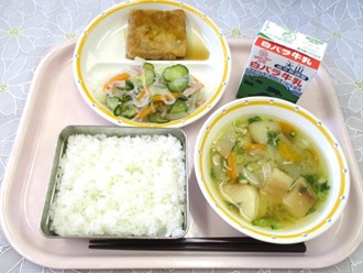 ご飯、牛乳、はたはたの南蛮漬け、とりっこ汁、白ねぎの炒め物
