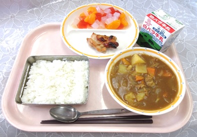 ご飯、牛乳、フランクフルト、豆乳カレーシチュー、ツナともやしのマリネ